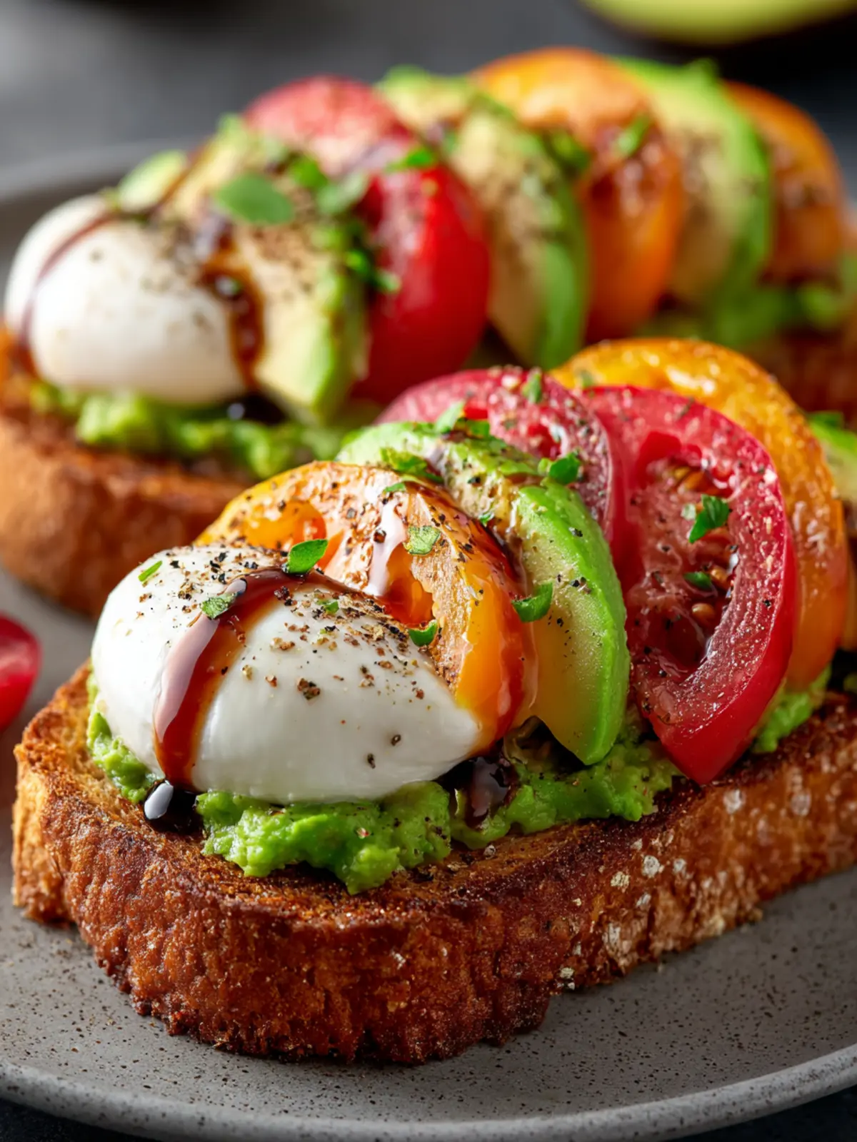 A delicious avocado toast topped with fresh burrata, cherry tomatoes, and basil, drizzled with balsamic glaze.