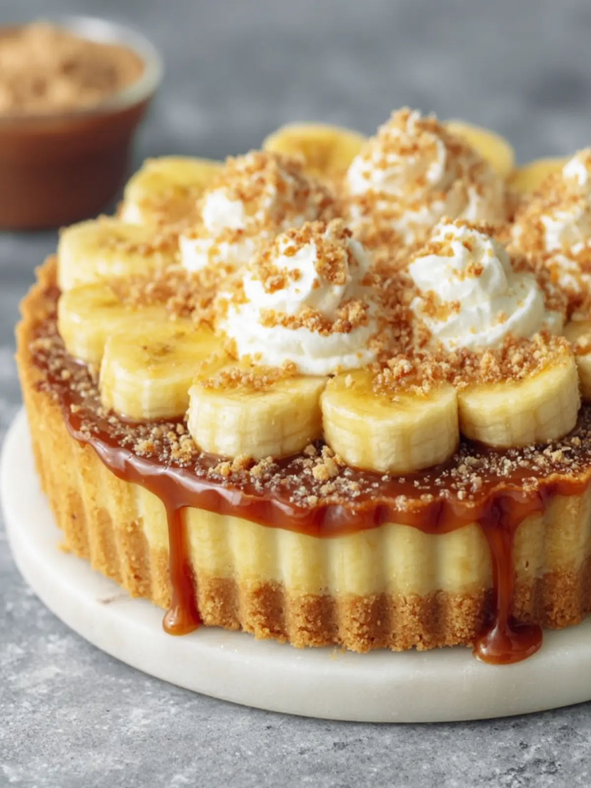 A delicious and creamy dessert featuring bananas, caramel, and a crunchy crust.