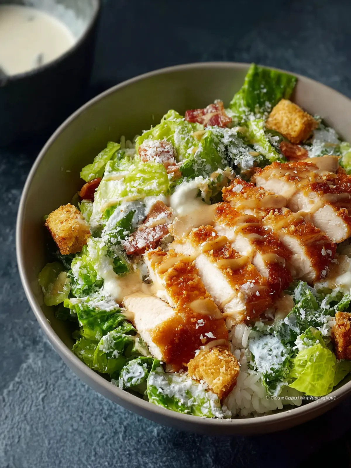 Delicious Chicken Caesar Rice Bowl with fresh ingredients, perfect for a quick meal.