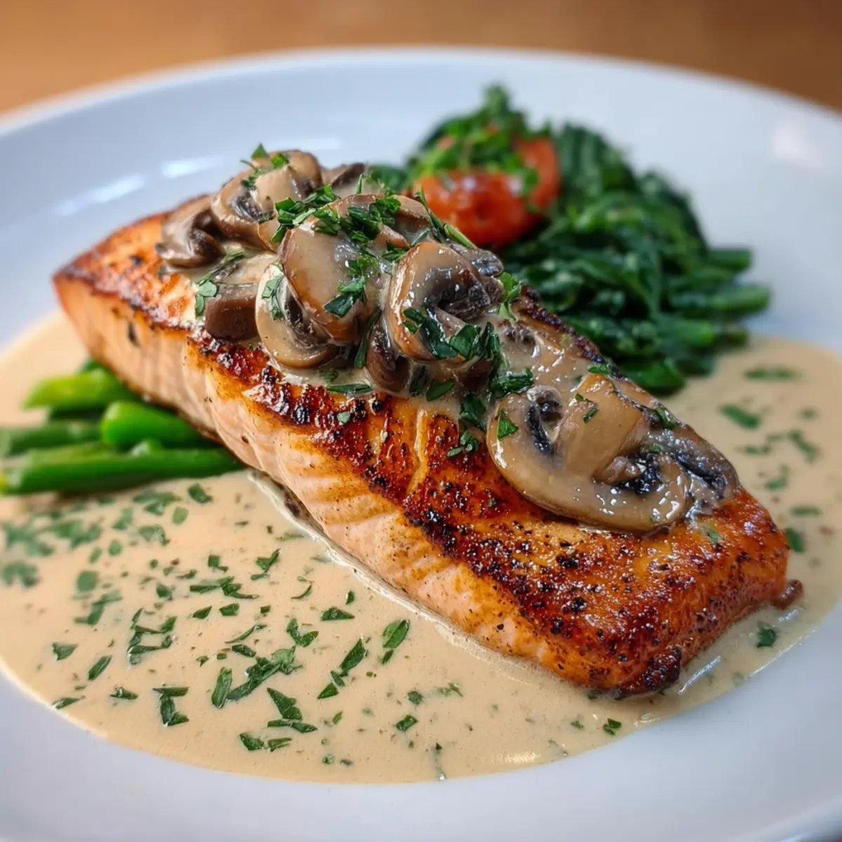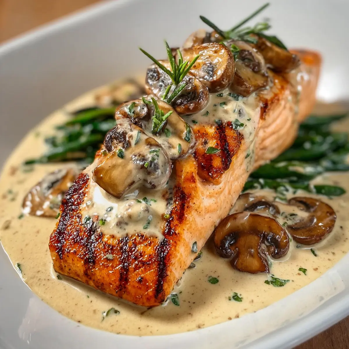 Fresh Herbs: Finally, a sprinkle of fresh parsley and thyme transports the grilled salmon with creamy mushroom sauce to new heights. These herbs add not just flavor but also a lovely aroma, enhancing the overall dining experience.