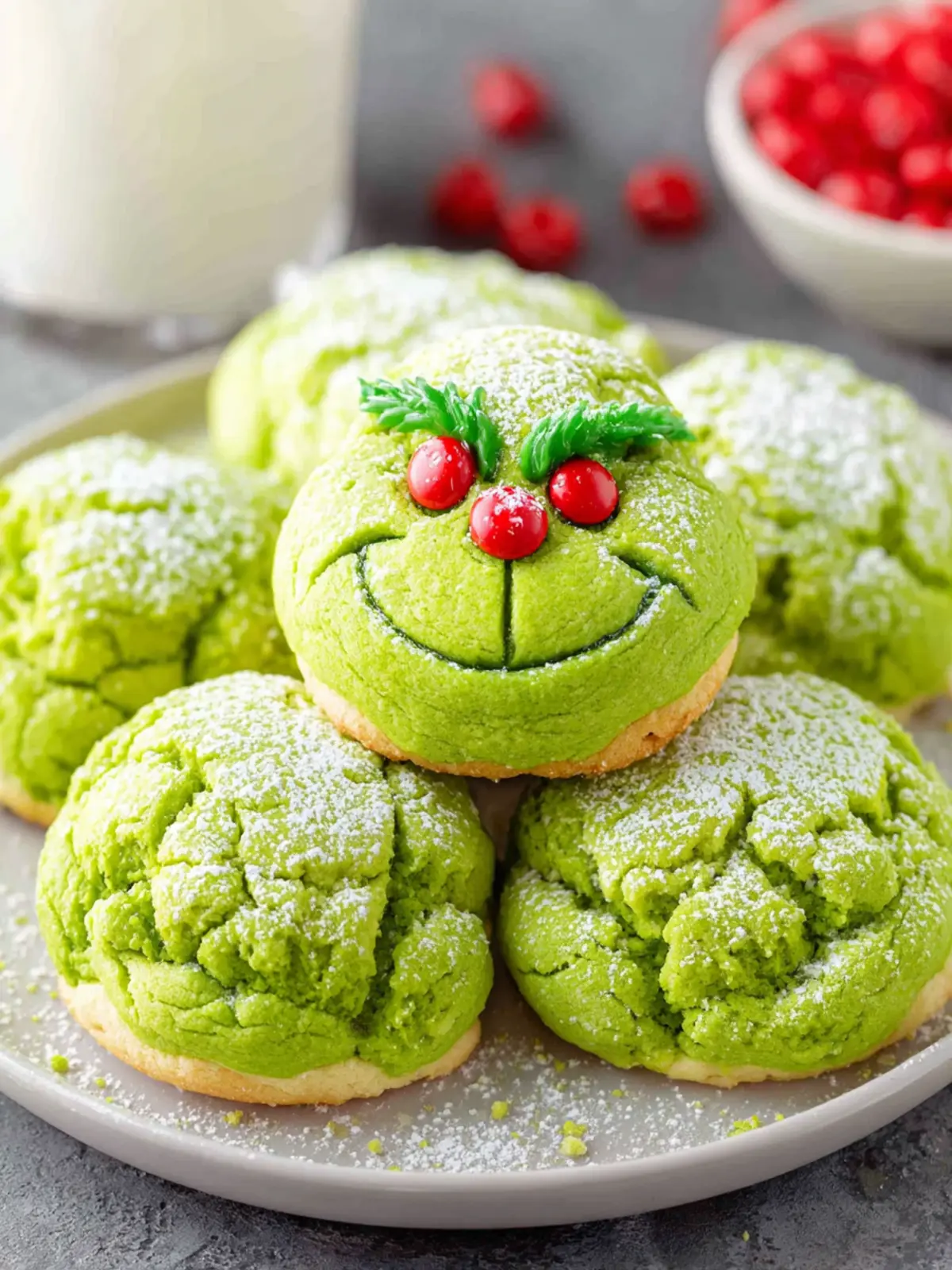 Serve your Grinch Cookies on a whimsical platter garnished with red and green sprinkles. You can even stack them in a glass jar for a pop of color and charm on your holiday table.