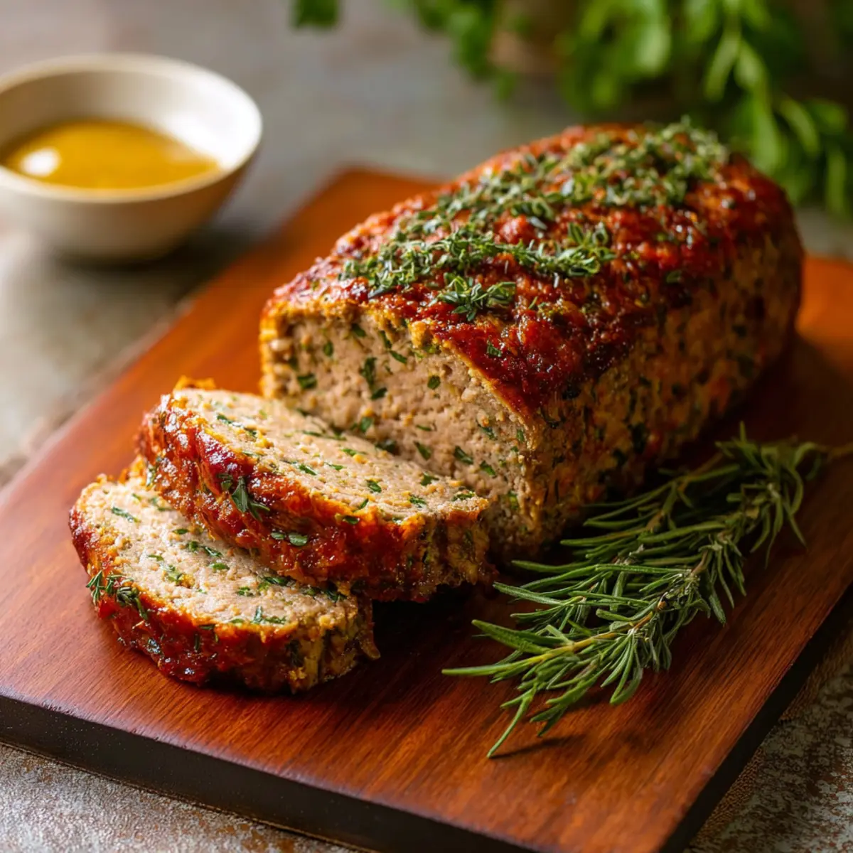 - Glaze the Loaf: In a separate bowl, combine ketchup and Worcestershire sauce. Spread this glaze over the top of the herb layer.