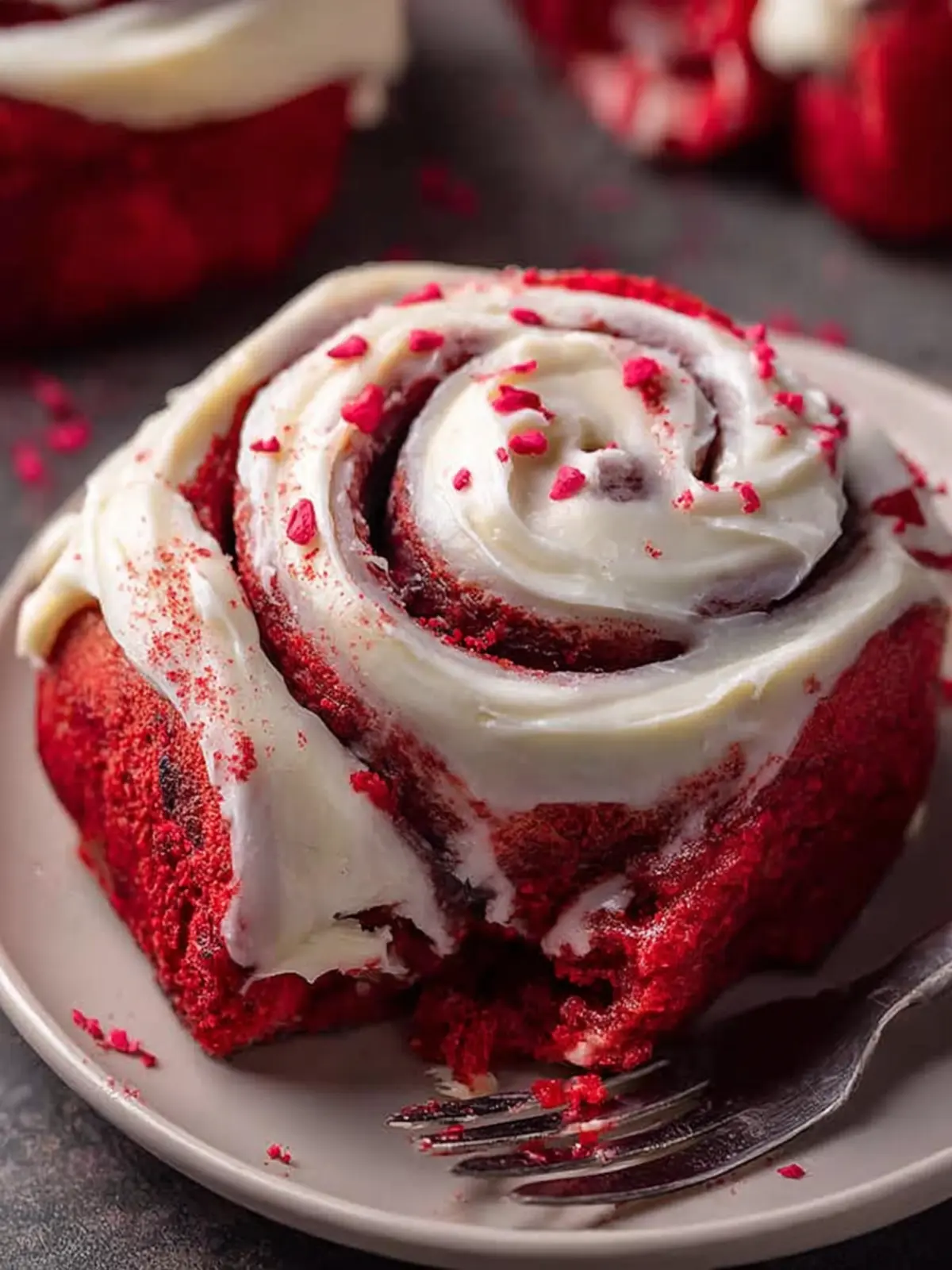 Deliciously soft and fluffy red velvet cinnamon rolls topped with a creamy frosting.