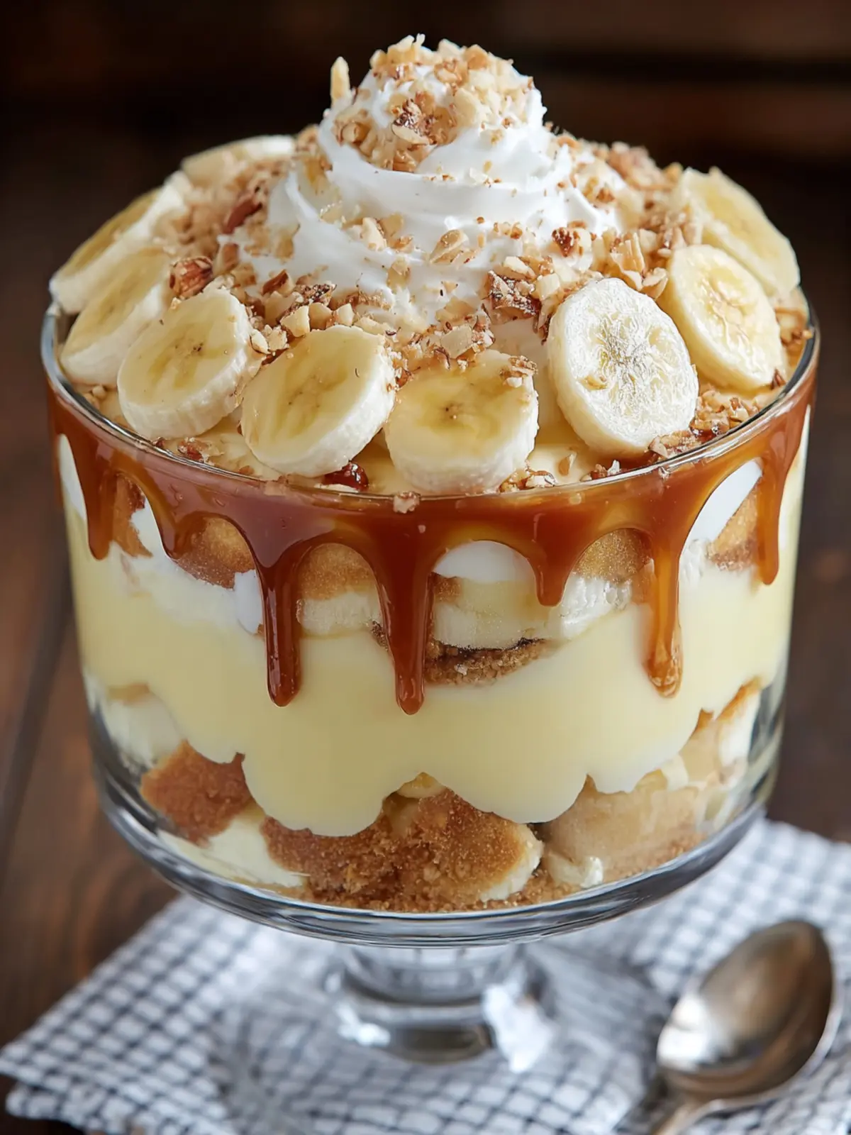 5. Assemble the Trifle: In a large trifle dish or glass bowl, start by layering a third of the crushed wafers. Add a layer of vanilla pudding, spreading it evenly. Follow with a layer of banana slices. Add a layer of whipped cream, smoothing it out with a spatula. Repeat the layers two more times, finishing with whipped cream on top. Garnish with additional banana slices and chopped nuts if desired.