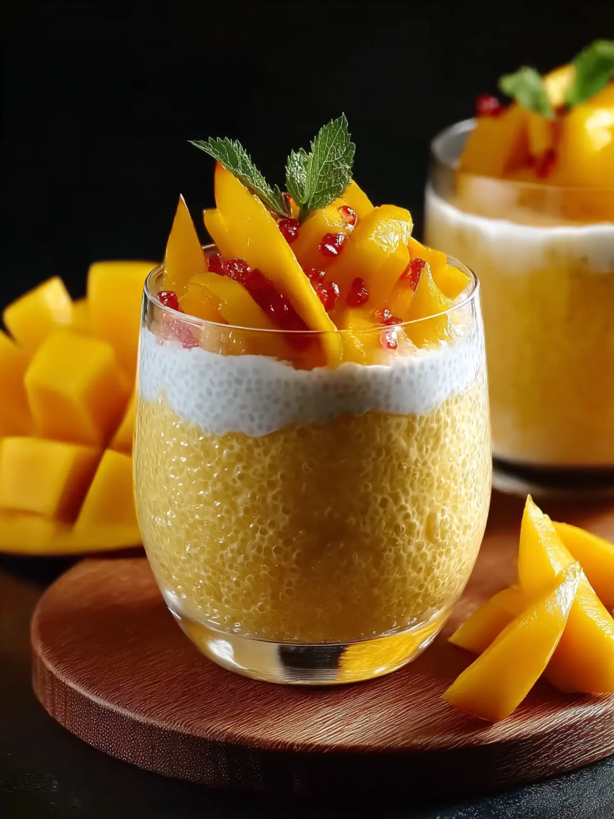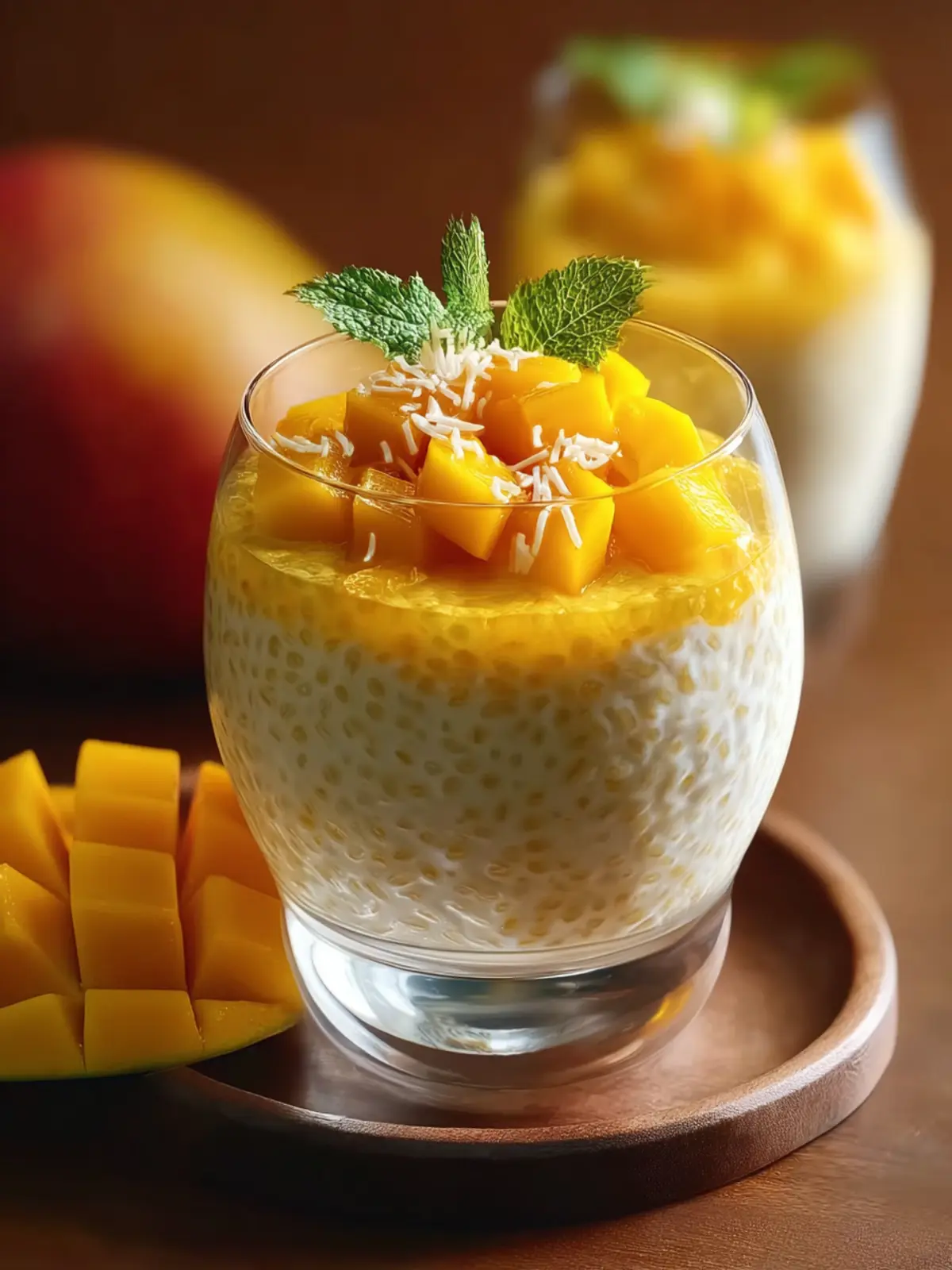 A delicious tropical dessert featuring chewy tapioca pearls and fresh mango puree, complemented by a creamy coconut milk base.
