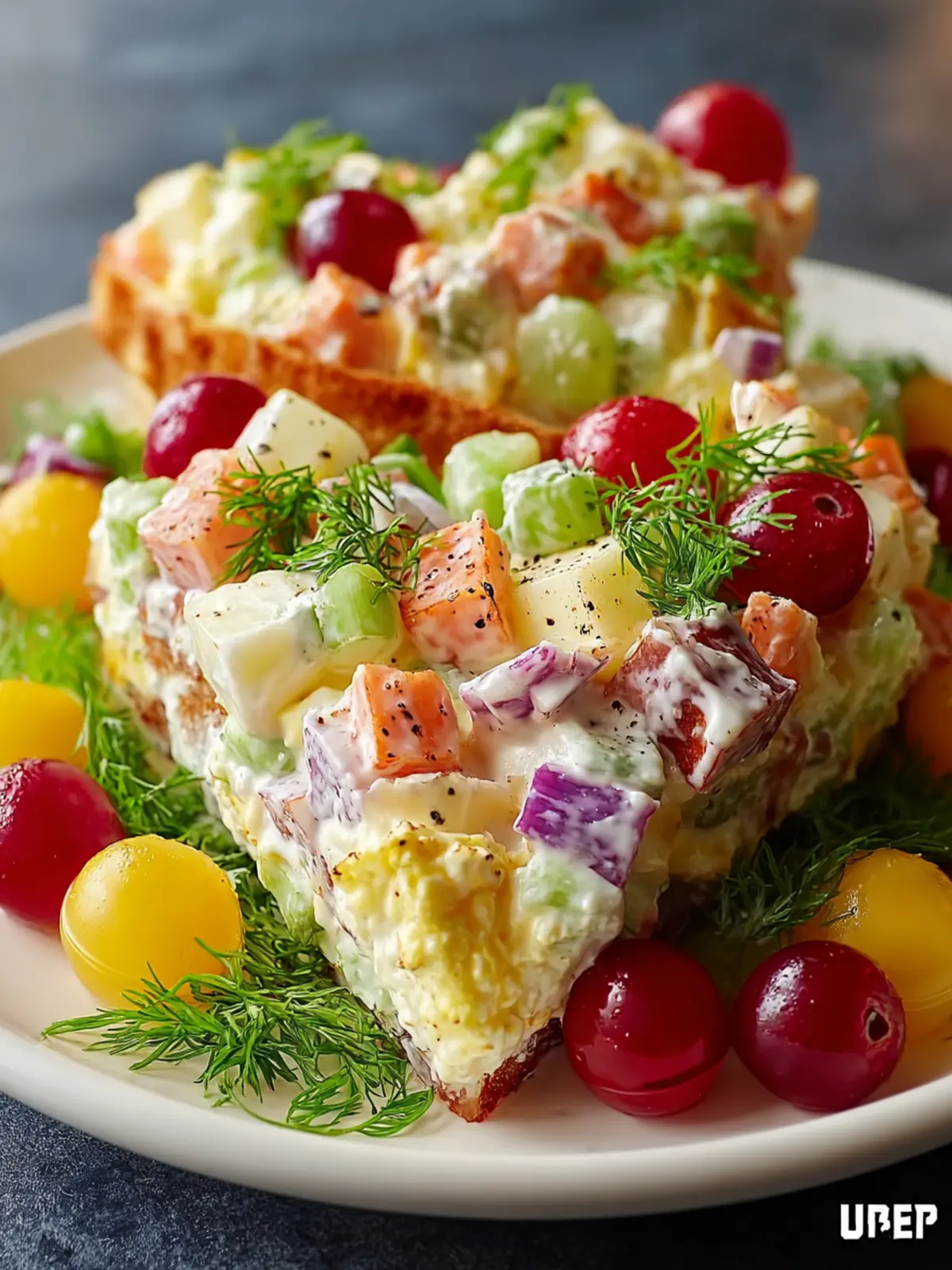 Accompany with Bread: Serve alongside crispy baguette slices or buttery crackers. The crunchiness complements the creamy texture of the salad, making each bite a delightful experience.