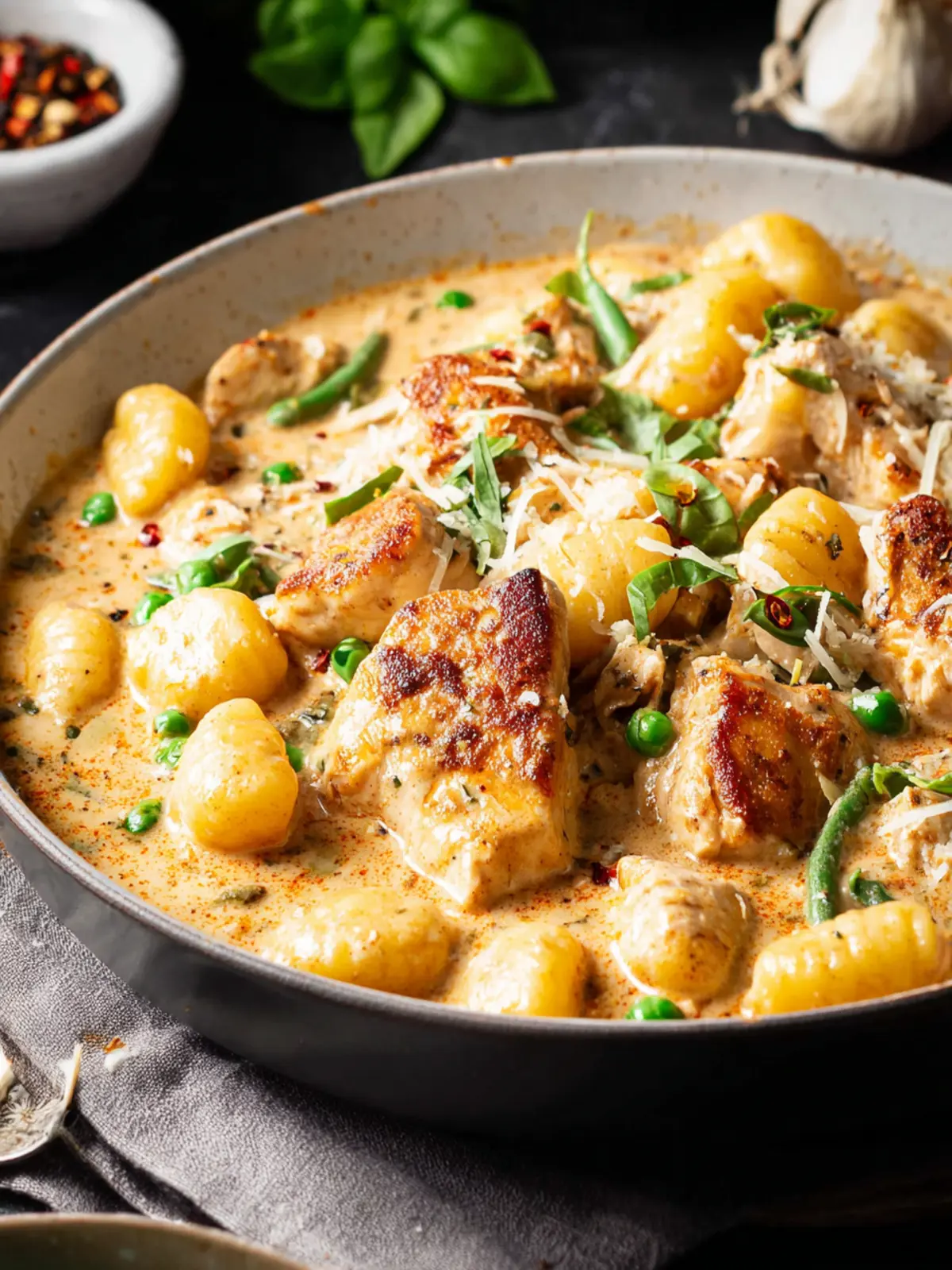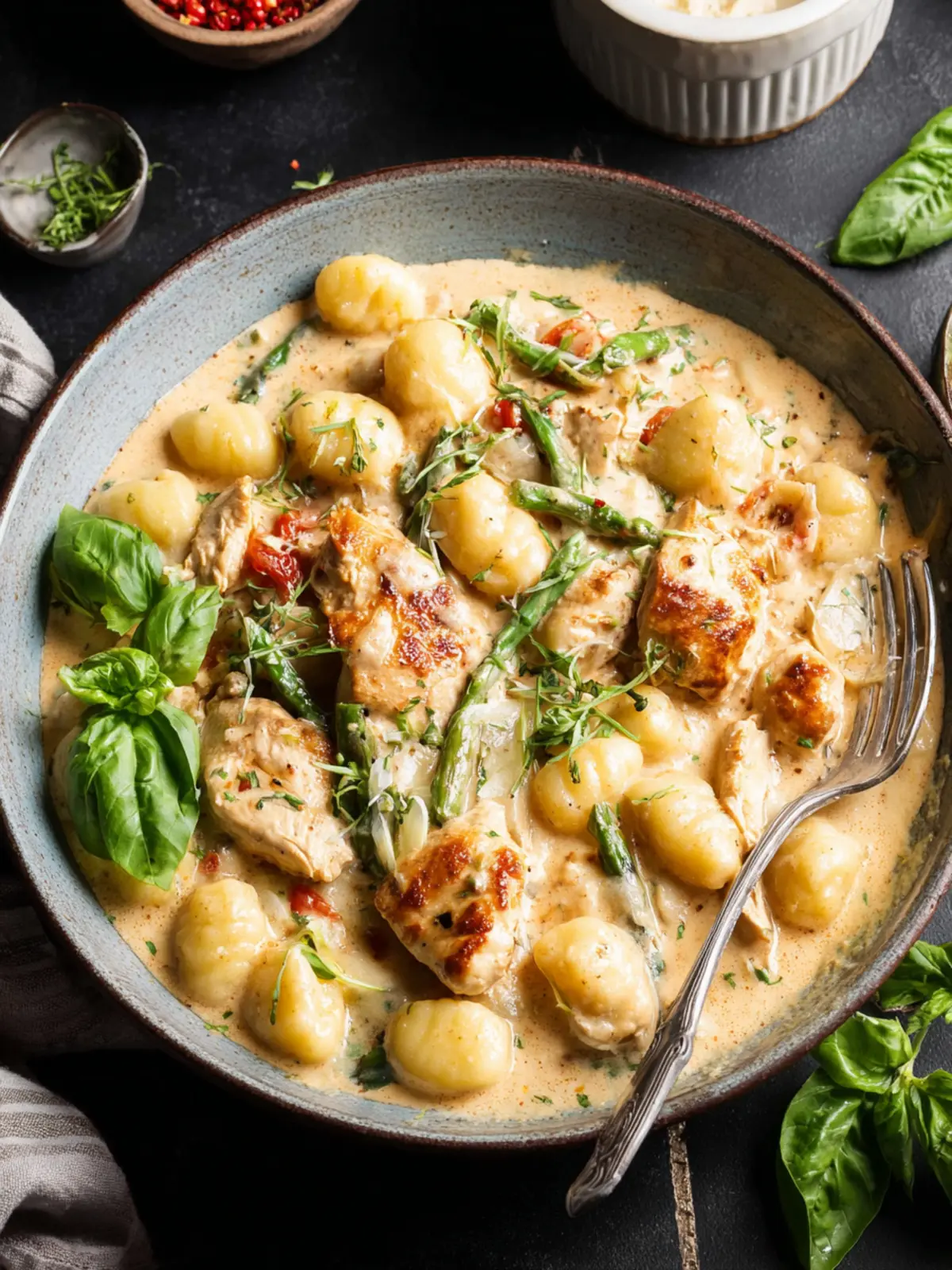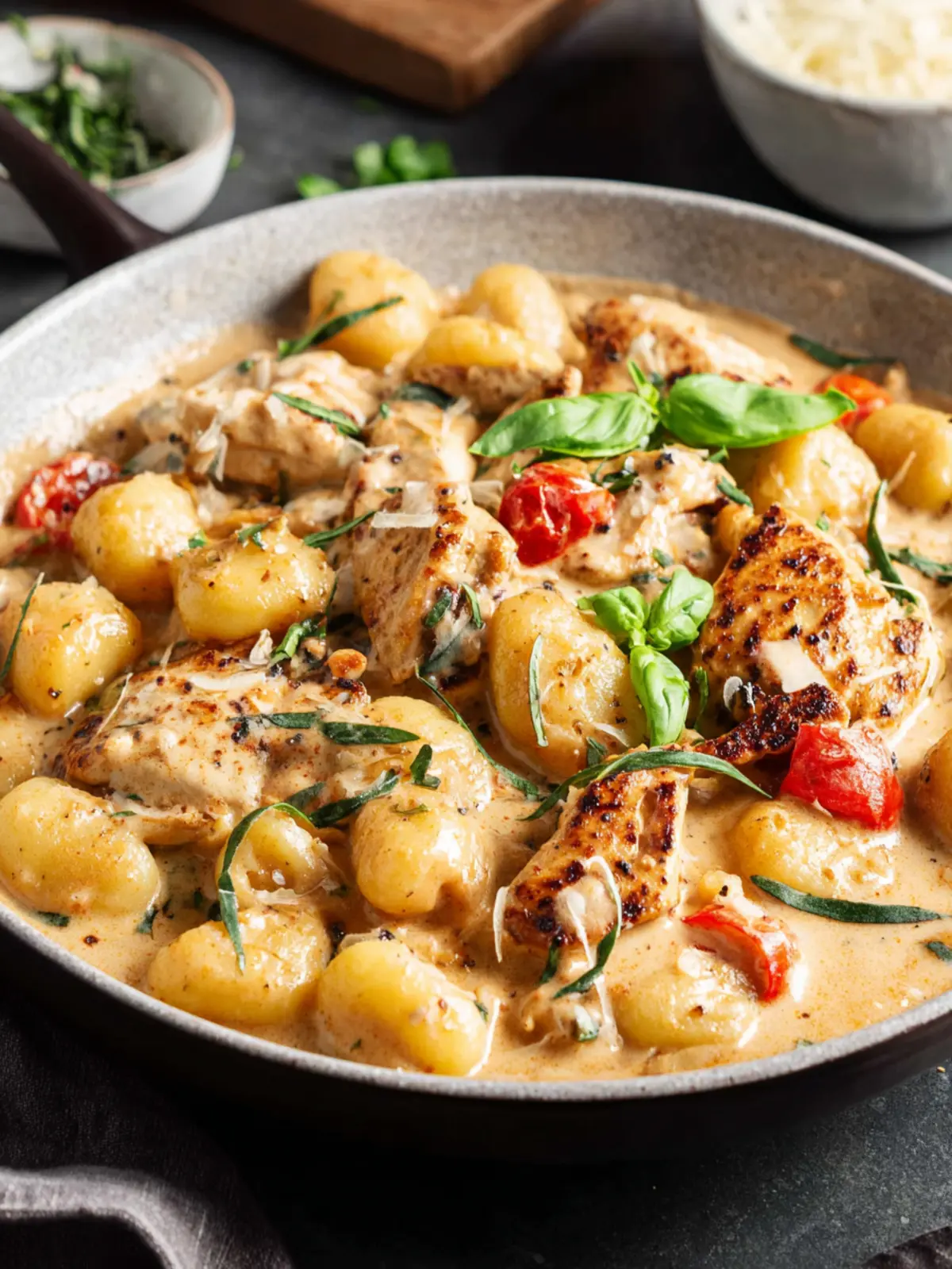 4. Combine: Add chicken and gnocchi to sauce. Stir in fresh basil.