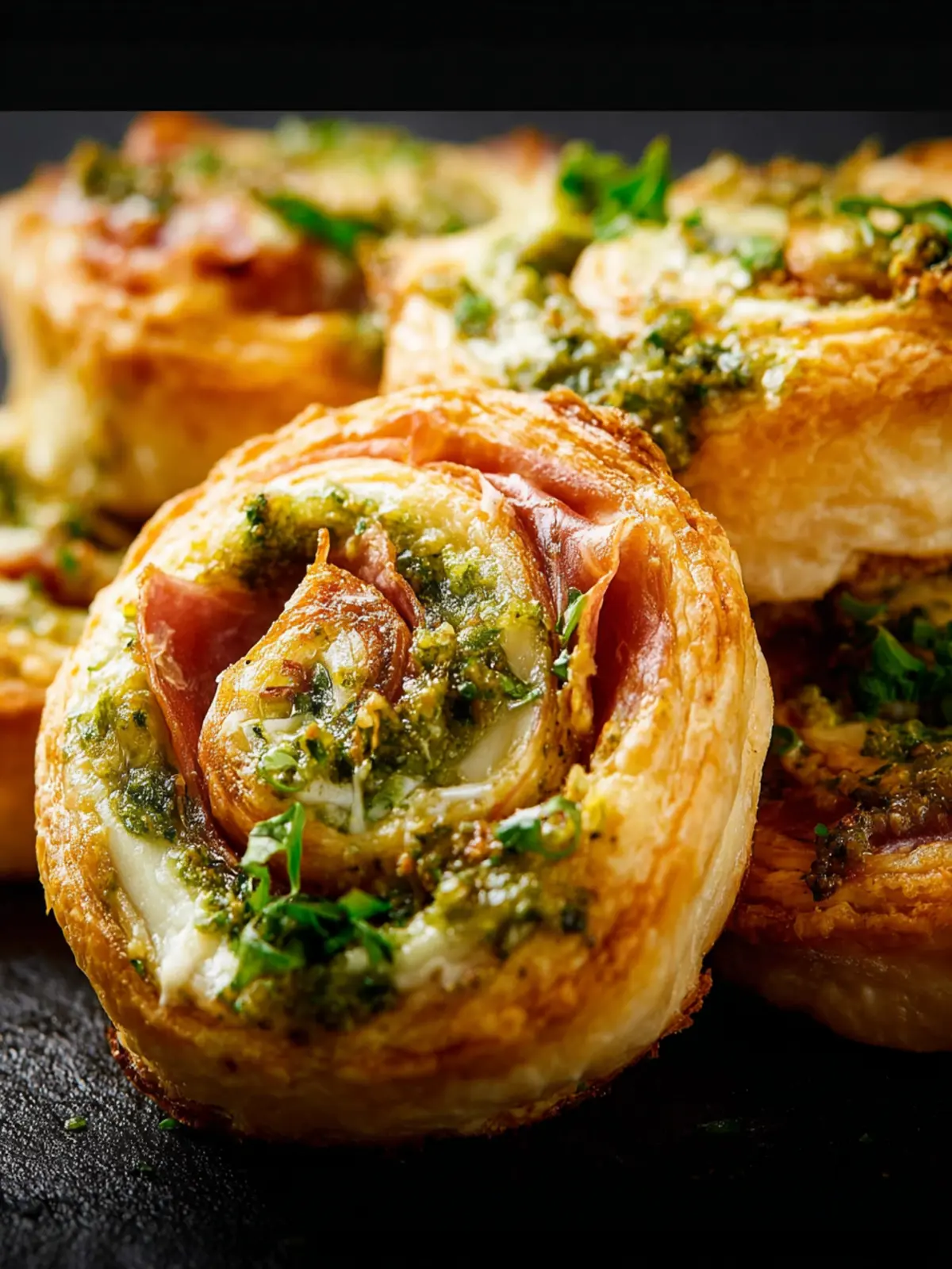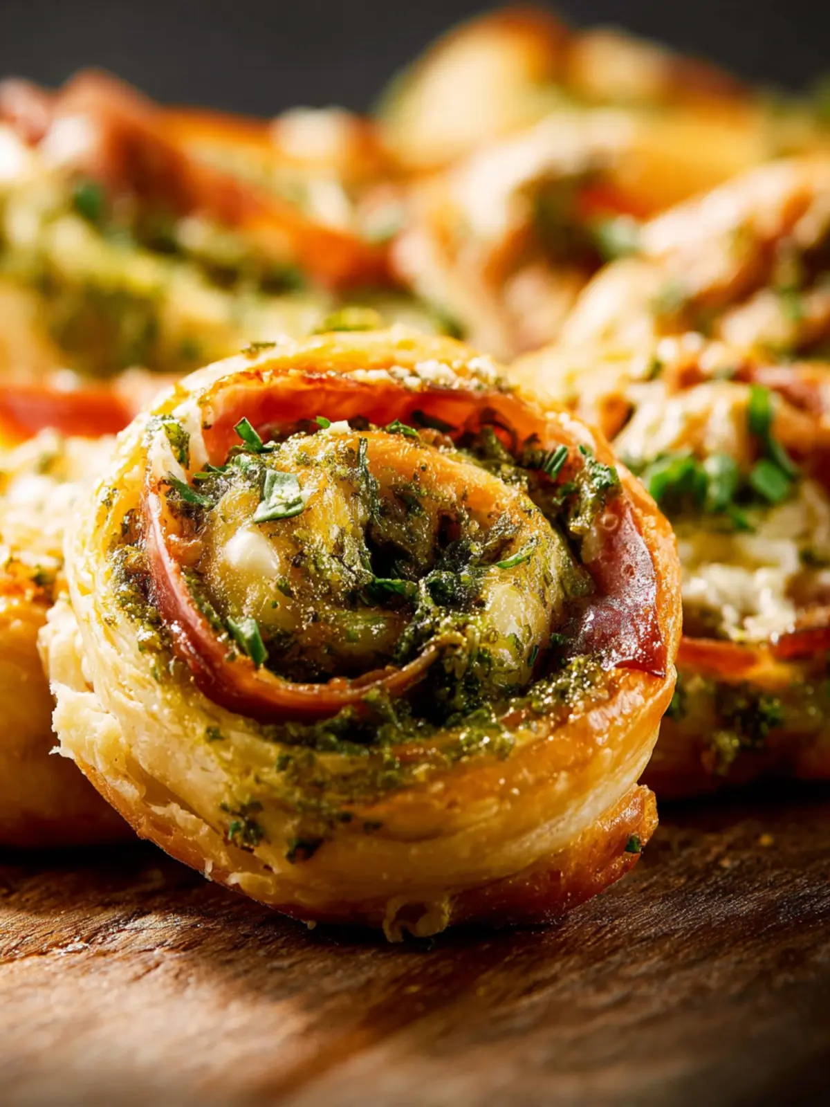 Delicious pinwheels made with creamy cheese, prosciutto, and fresh basil pesto, wrapped in flaky puff pastry.