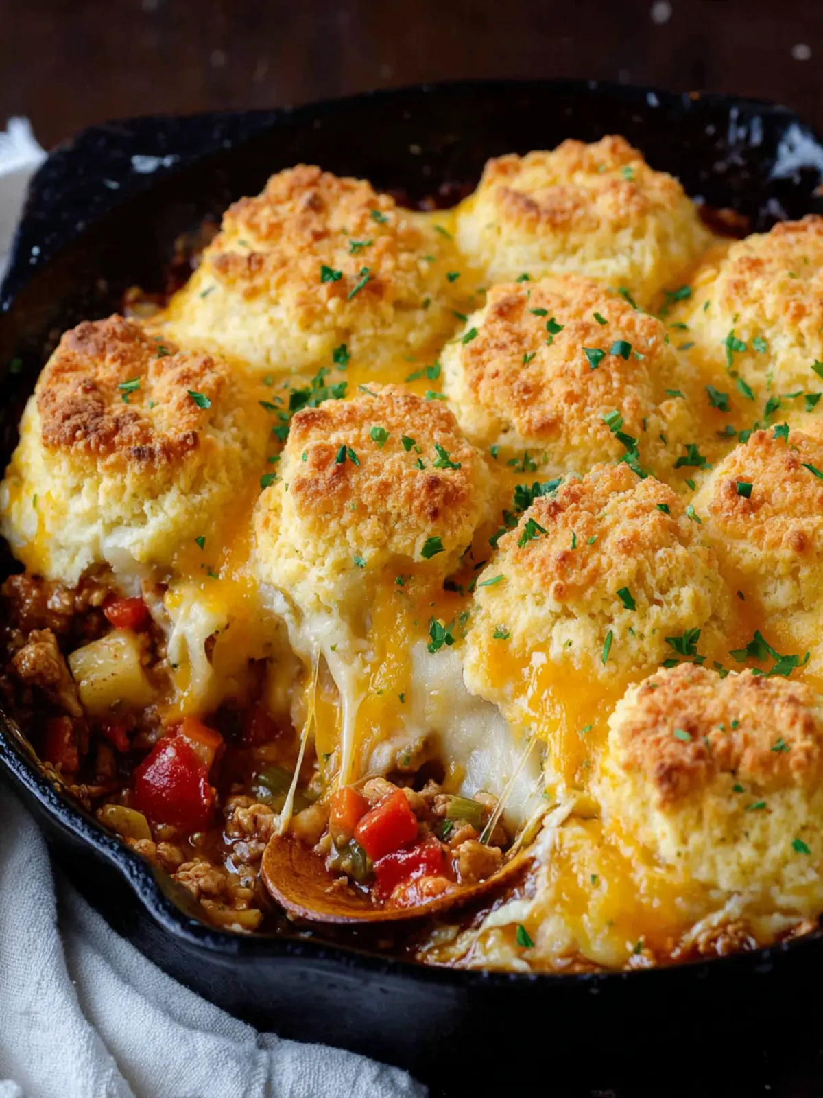 A hearty skillet dish with ground turkey and fluffy biscuits, perfect for a comforting meal.