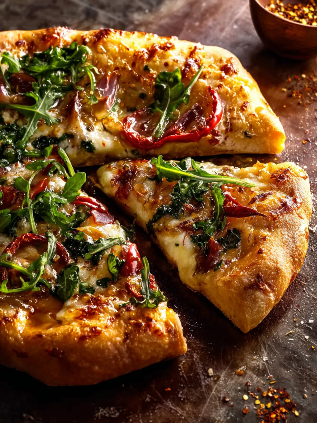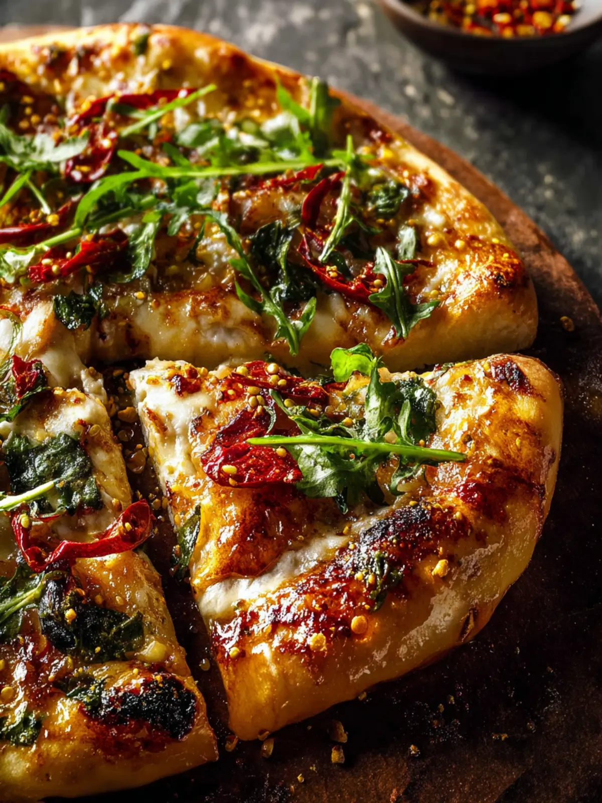 7. Drizzle with honey, add extra chili flakes, and top with arugula. Enjoy!