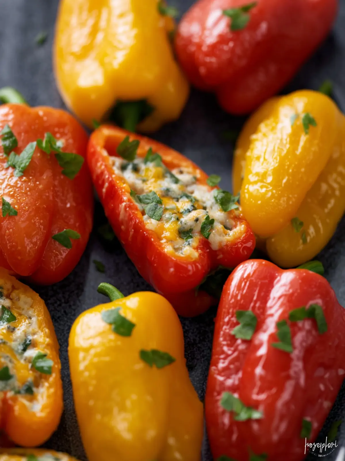 Deliciously stuffed miniature sweet peppers with cream cheese, cheddar, and fresh herbs.