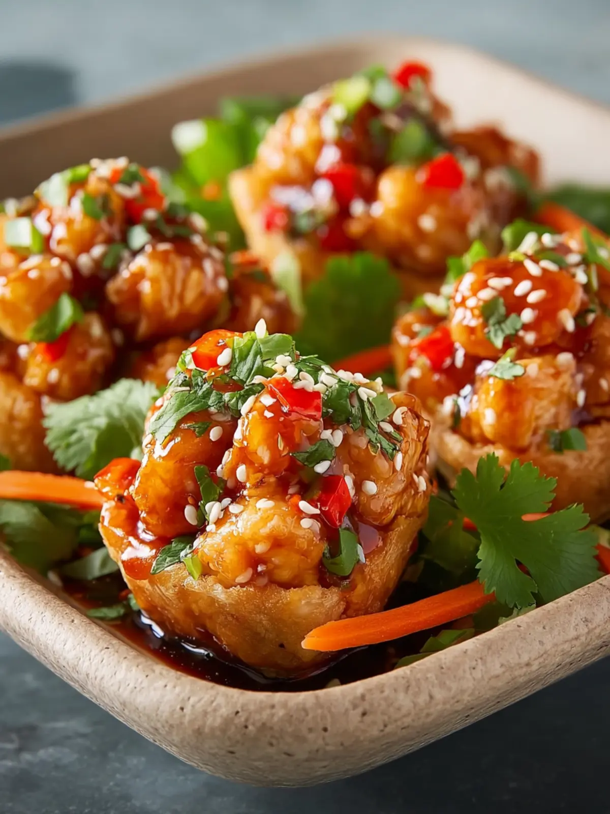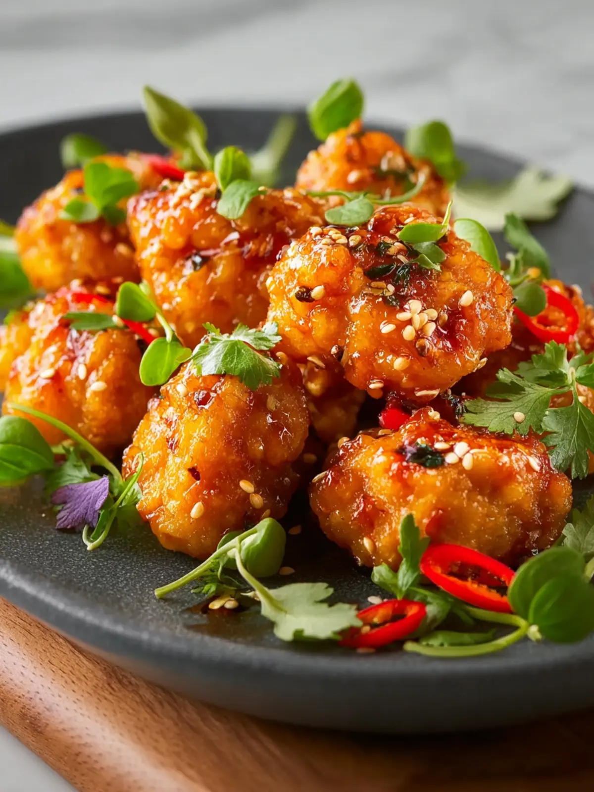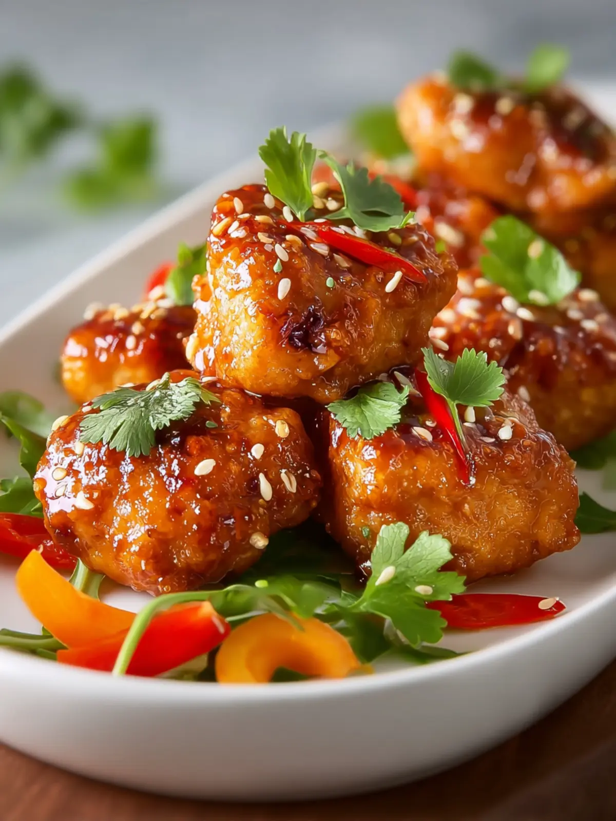 Delicious fried chicken pieces coated in a sweet chili sauce, garnished with fresh ingredients.